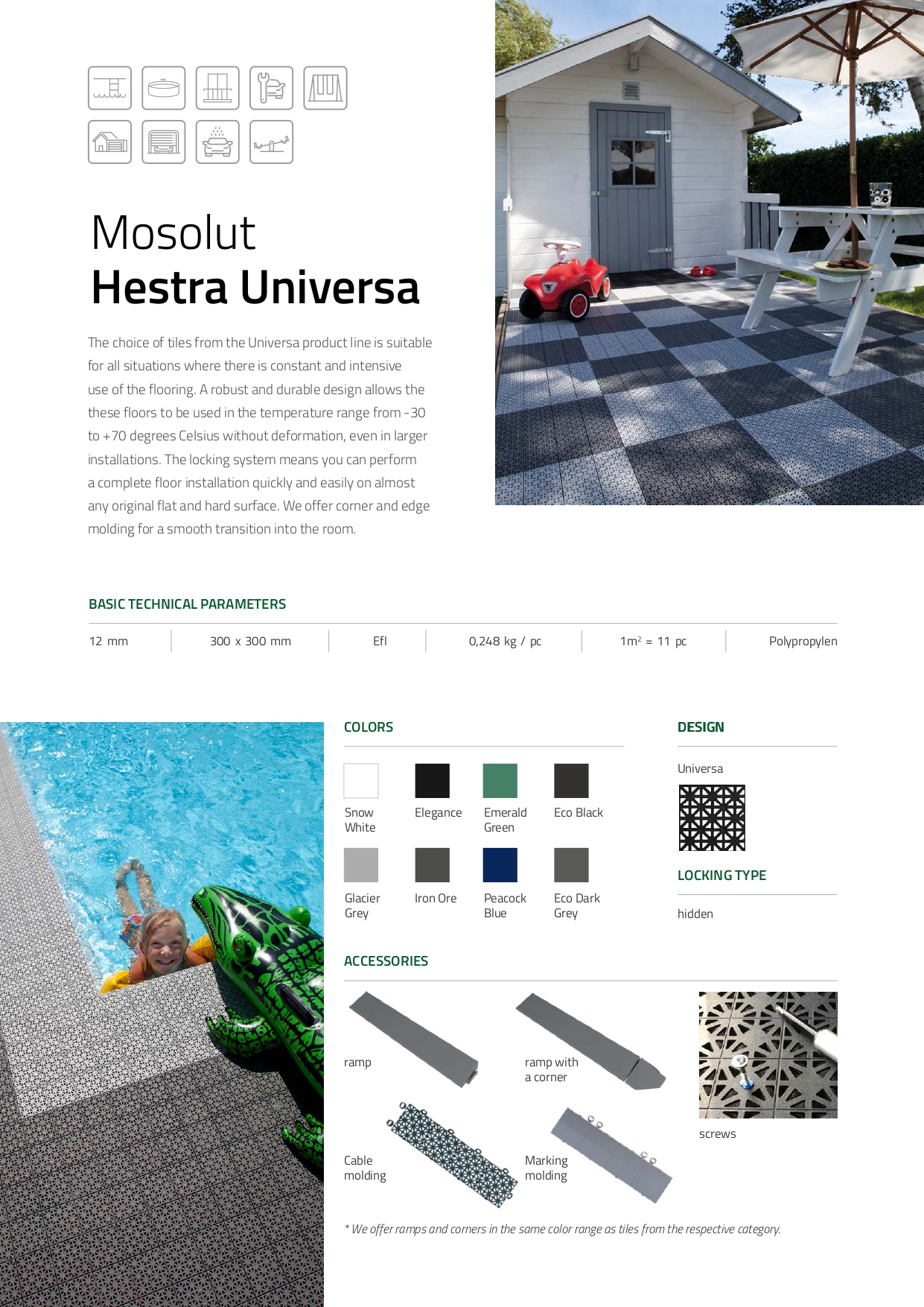 UV resistant tilefor use outdoors around terraces, pools, Verandahs and Pergolas. Colours: Black, Grey, Light grey, White, Green and red